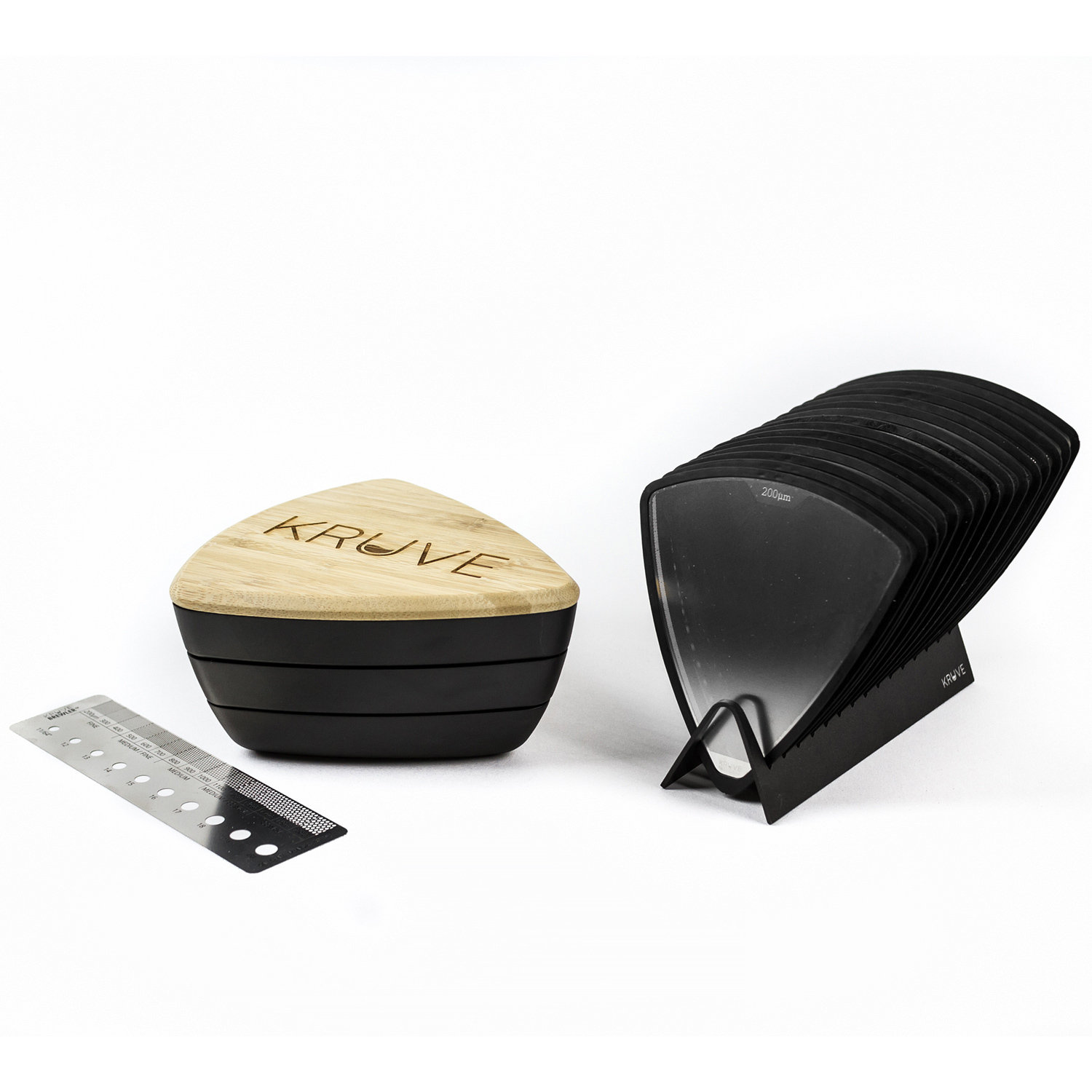 Kruve Sifter is a professional coffee sifter, which allows you to improve the flavour of your coffee. The GRIND PLUS set consists of a black Kruve sifter, fifteen GRIND sieves: 200, 300, 400, 500, 600, 700, 800, 900, 1000, 1100, 1200, 1300, 1400, 1500, 160 0μm and a sieve holder. It is perfect for espresso and various alternative brewing methods. The set also includes Kruve Brewler. Grinding coffee is not only about the grinding size adjusted to the brewing method, but also about as equal coffee particles as possible. It gives a better control over extraction and brings out clean flavour. Kruve enables you to remove the fines (too small particles) and boulders (too large particles), keeping perfect grinds separated.